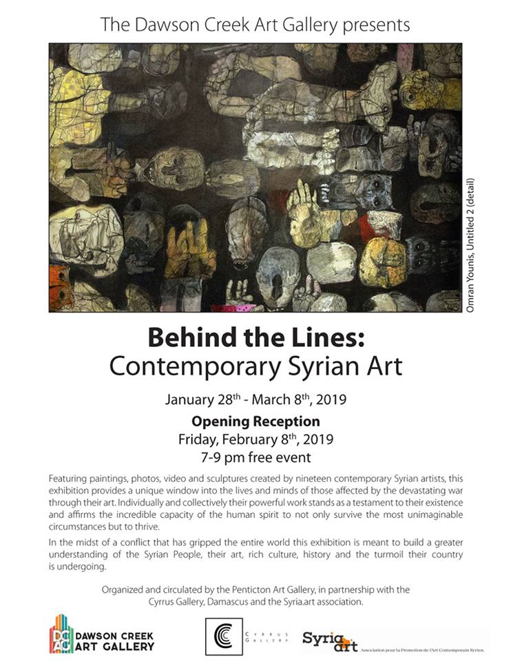 BEHIND THE LINES: CONTEMPORARY SYRIAN ART est une exposition itinérante à travers le Canada. L’exposition héberge 20 artistes syriens avec environ 100 œuvres de multiples média, y compris vidéo, photographie, peinture et sculpture.