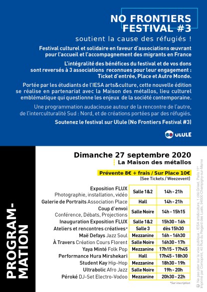 NO FRONTIERS FESTIVAL est un évènement culturel et solidaire en faveur d’associations œuvrant pour la cause des migrants en France. Ce projet est porté par un groupe de jeunes professionnels de l’art et de la culture, étudiants en 2ème année de Bachelor Productions culturelles (Spectacle Vivant, Exposition) et Communication culturelle.