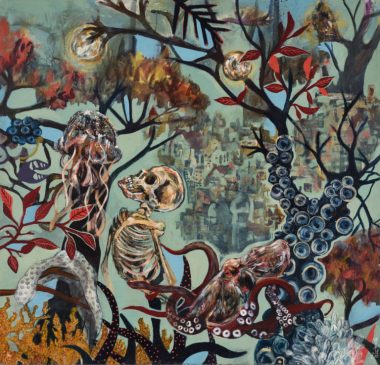 La peinture de Noor maintient une approche narrative qui utilise une sorte de « réalisme magique » dans lequel, comme dans la matière onirique, la qualité hallucinatoire des images est un langage à interpréter, des sortes d’hiéroglyphes, révélant sans cesse leur aura énigmatique. Regardons de plus près cette œuvre figurative polymorphe : des peintures comme des polypes d’images, des cellules polypaires, des têtes qui partagent l’essence d’un seul corps, des corps dans lesquels se réalise une hybridation entre technologie et biologie, désormais indissociable, soudée en une seule entité monadique, fermée dans son irréductible altérité. Un royaume animal, végétal et humain immergé dans la même apnée, suspendu à l’instant d’une prolifération d’entrelacs où se reproduit le mystère de la descendance réciproque. La semblance des femmes, plus que marquée par des déformations primitivistes et des citations de grands peintres expressionnistes, rappelle les visages de certaines femmes âgées. Des visages tendus à la limite de la subsidence, raccommodés par des chirurgiens sorciers pour réaliser le rêve d’une photogénèse perpétuelle, et, figée dans la chair vive, la pose iconique d’une résistance à l’inévitable dégénérescence, l’utopie de la jeunesse éternelle qui finit immanquablement par tomber dans sa propre dystopie.